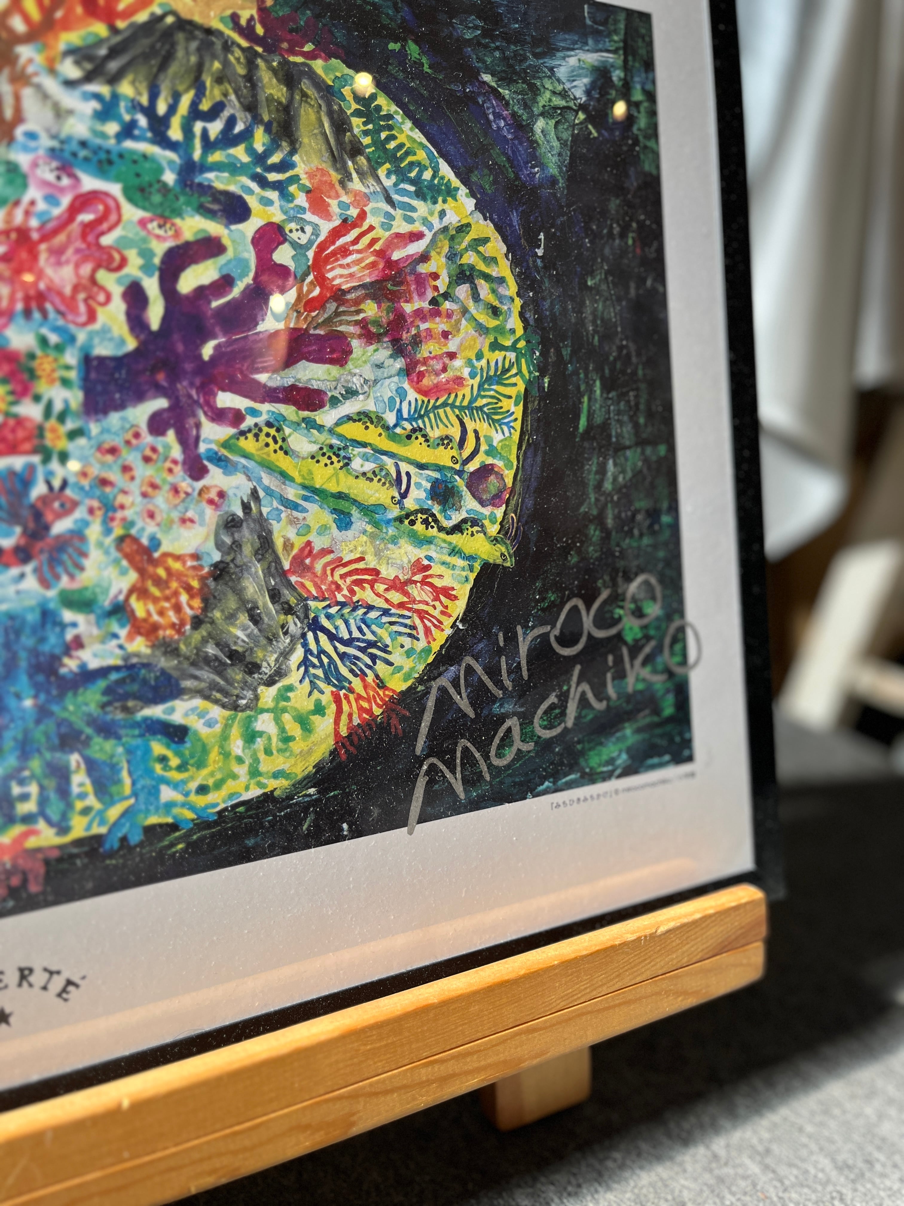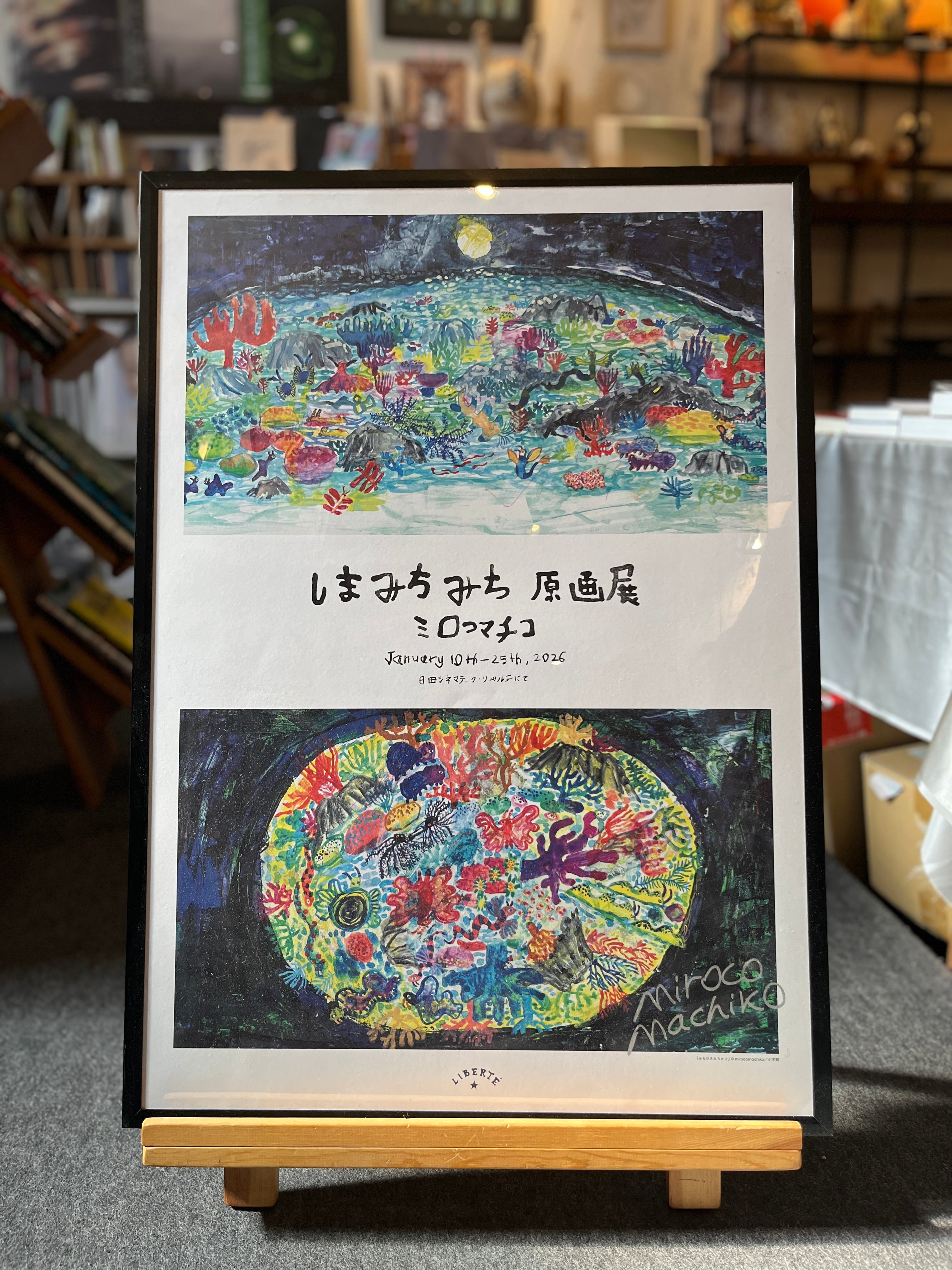 今年2026年リベルテにてゆかりのアーティスト ミロコマチコ「しまみちみち原画展」を開催し、ミロコマチコさんの3日間の神出鬼没サイン会も行いました。展覧会のミロコマチコさんの数量限定直筆サイン入りポスターです。